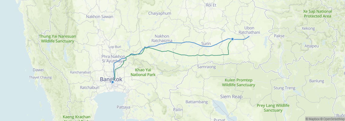 It takes 7-10 hours to get from Bangkok to Sisaket by train and 9 hours 25 minutes by bus.