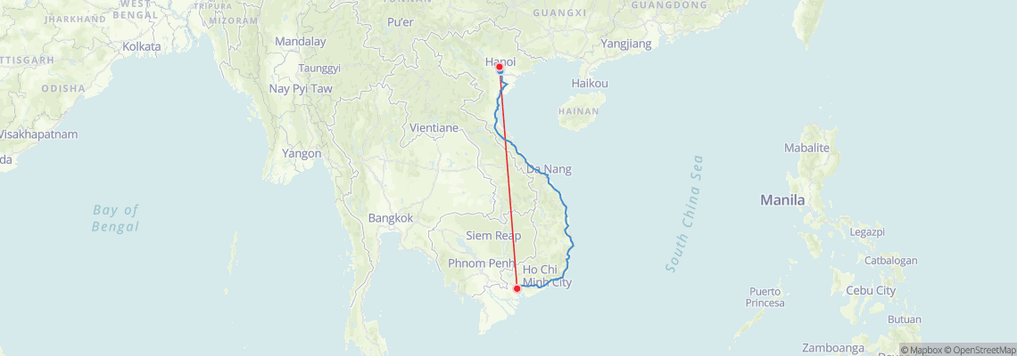 The travel distance between Hanoi and Ho Chi Minh is 1,684 km. There are two options to travel from Ho Chi Minh to Hanoi: taking a flight or a train.