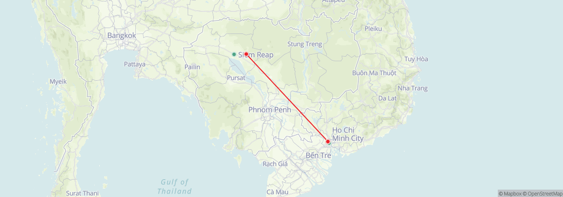 The travel distance between Ho Chi Minh and Siem Reap is 420 km. The are two options to travel from Ho Chi Minh to Siem Reap: taking a flight or a bus.
