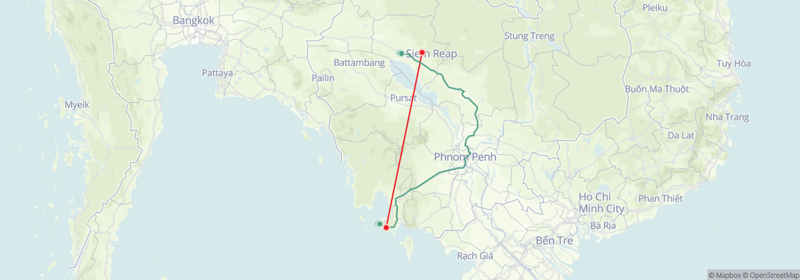 The travel distance between Sihanoukville and Siem Reap is 530 km. There are two options to travel from Sihanoukville to Siem Reap: taking a flight or a bus.