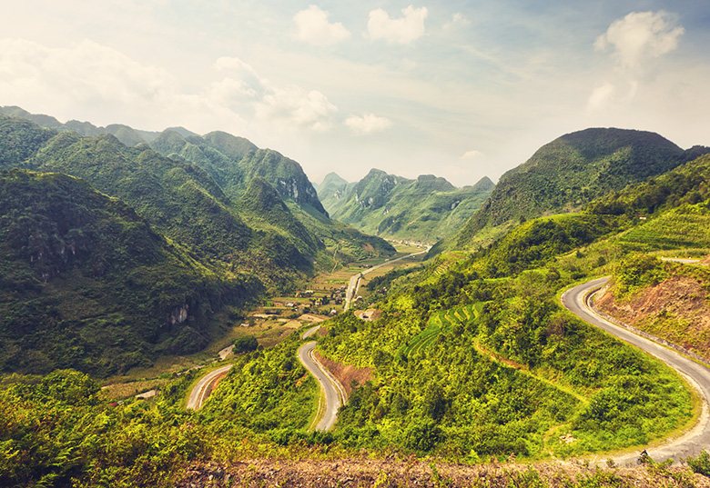 Al norte, el circuito de Ha Giang desafía a los viajeros más aventureros con carreteras serpenteantes que atraviesan Dong Van y el paso de Ma Pi Leng que desciende hacia el desfiladero del río Nho Que.